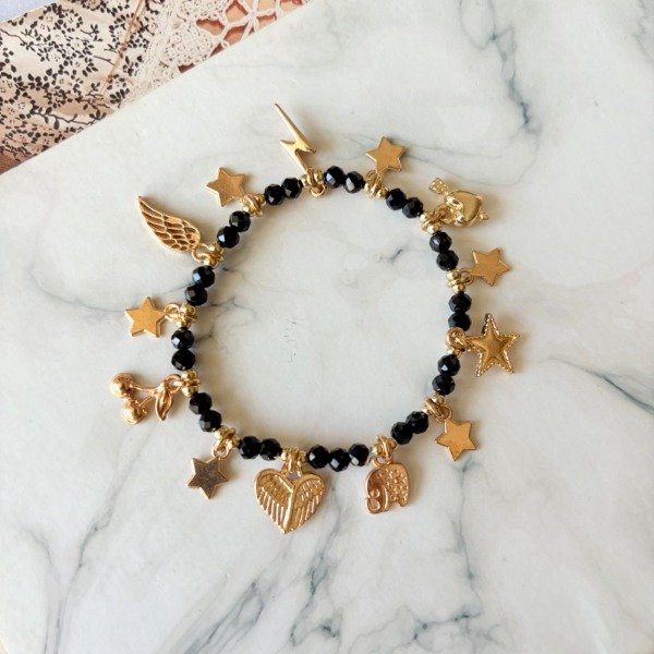 Pulsera elástica de rocas de cristal con múltiples dijes exclusivos de distintos tamaños y formas dorados